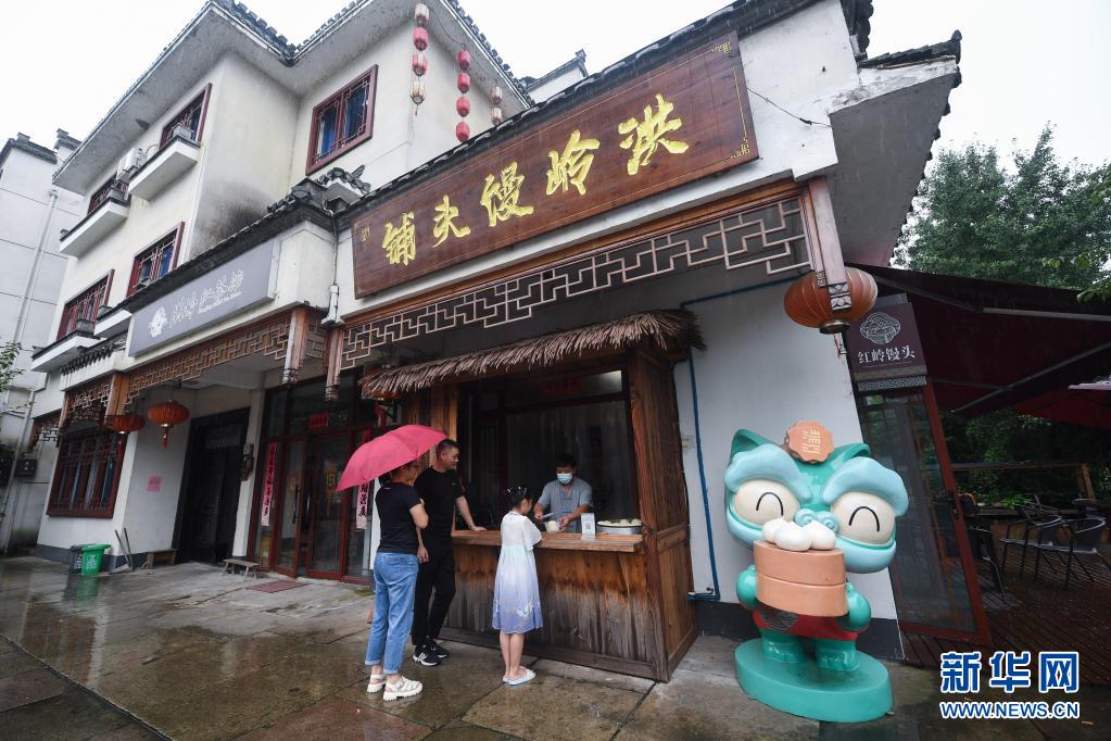 8月13日,游客在杭州市临安区湍口镇的洪岭馒头铺购买当地的特色美食。
