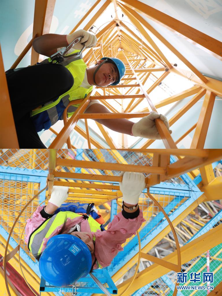 拼版照片:上图为8月12日,在中建三局兰州新区一保障房项目工地上,塔吊司机王喜平爬下塔吊;下图为8月12日,王喜平的妻子、同为塔吊司机的苏小霞爬上塔吊。