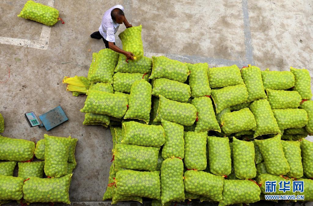 8月13日,农户在河北省石家庄市赞皇县赞皇镇一核桃交易市场搬运核桃。
