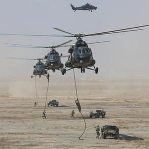 8月13日,参加“西部·联合-2021”演习第二阶段联合实兵行动演练的陆军特战队员索降后搭乘“山猫”全地形车快速突击。