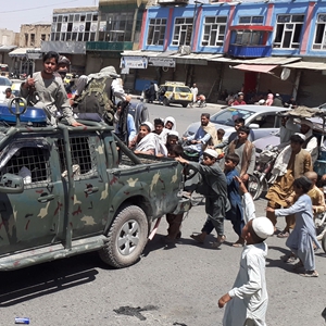 8月13日,塔利班武装人员在阿富汗第二大城市坎大哈街头。