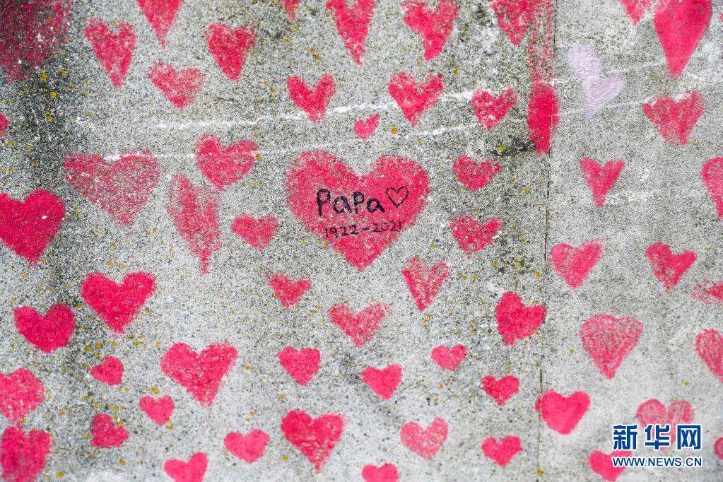 这是8月9日在英国伦敦拍摄的国家新冠纪念墙上的红心和留言。
