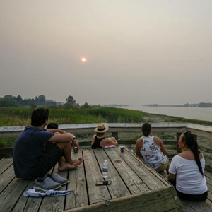 8月13日,人们在加拿大温哥华的公园里望向雾霾中的天空。受山火等因素影响,温哥华地区遭遇雾霾天气。新华社发(梁森摄)