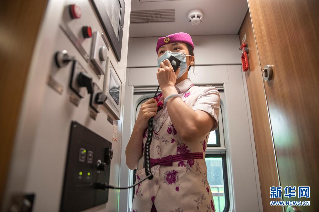 8月14日,铁路工作人员在应急演练活动上进行紧急撤离车厢广播演练。