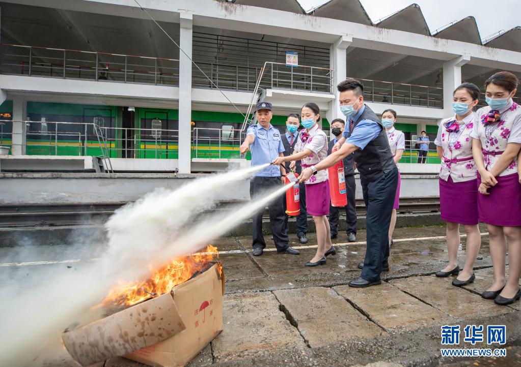 8月14日,铁路工作人员在应急演练活动上使用灭火器灭火。