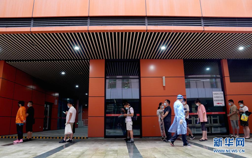 8月14日,在静安体育中心集中接种点,工作人员提醒排队的人保持间距。
