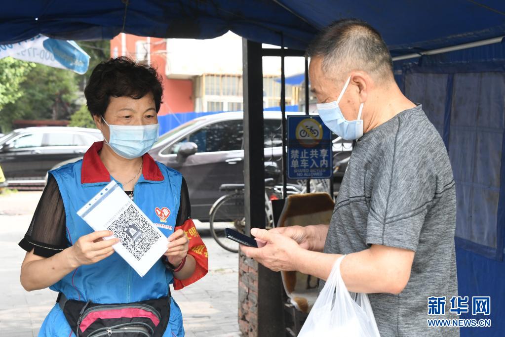 在北京市海淀区蓟门里社区出入口,董星梅(左)指导进入社区的人员扫描健康宝(8月11日摄)。