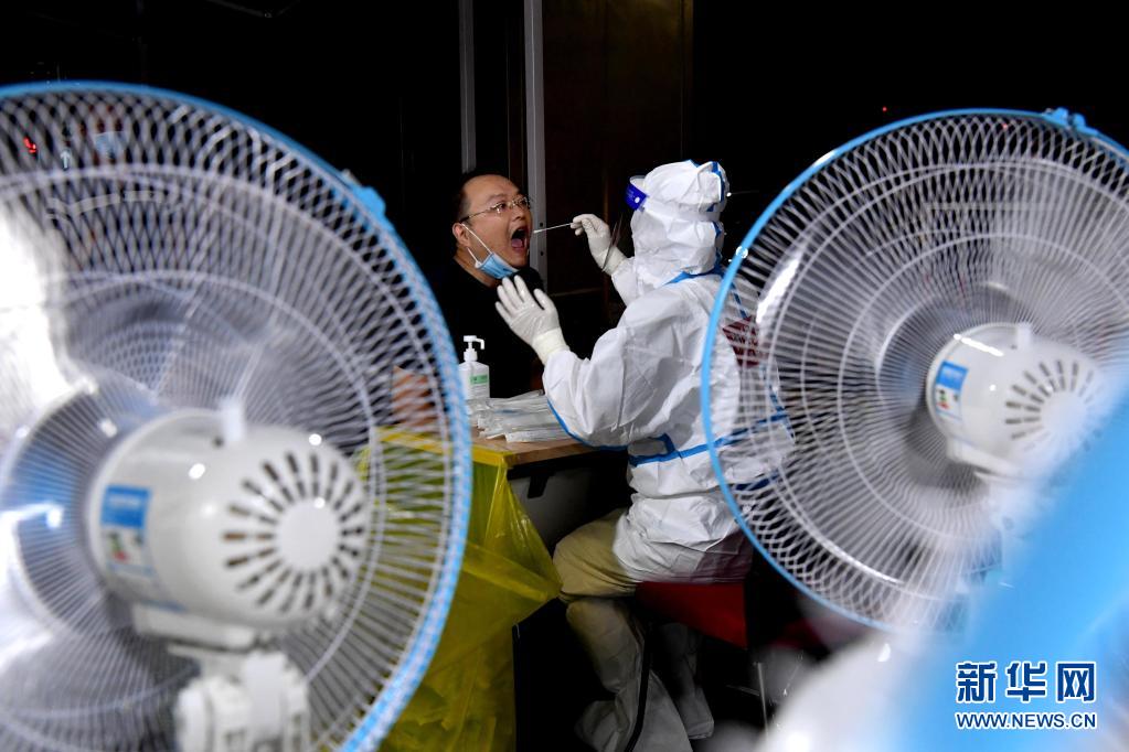 8月8日,在郑州市经六路核酸检测点,工作人员对市民进行核酸检测取样。