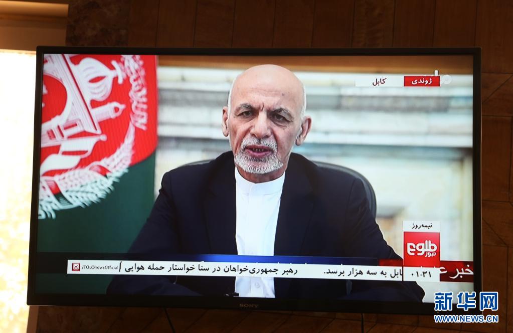 8月14日,阿富汗首都喀布尔的电视上正在播出阿富汗总统加尼的电视讲话。