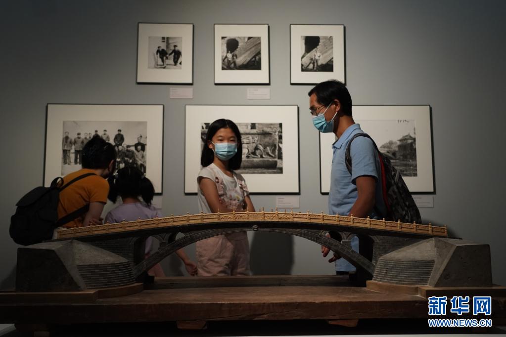 8月14日,观众在观看“栋梁——梁思成诞辰一百二十周年文献展”中的安济桥(赵州桥)模型。