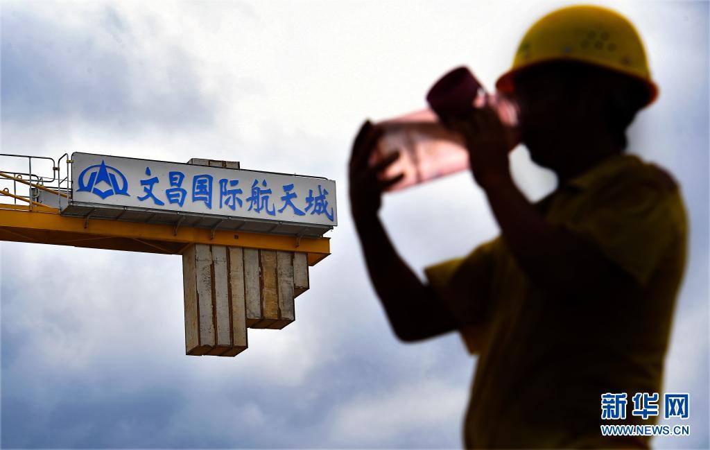 在文昌国际航天城产业服务中心项目工地,工人在施工间隙喝水(8月12日摄)。