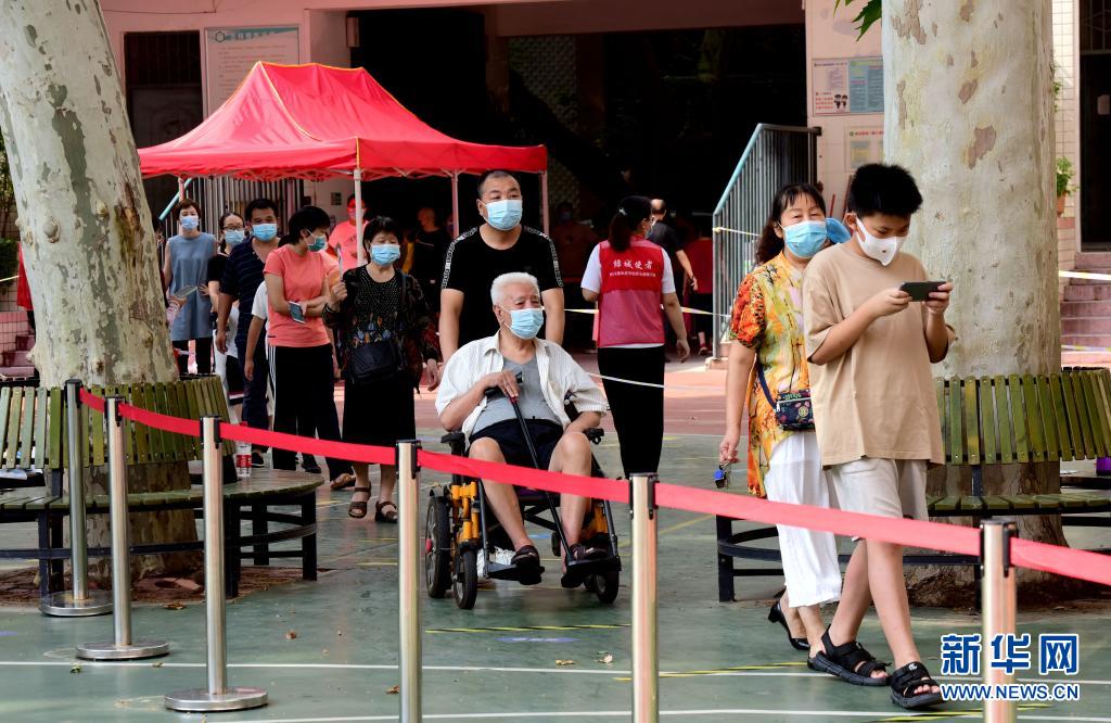 8月15日,市民在郑州市纬一路小学检测点排队,准备进行核酸检测取样。