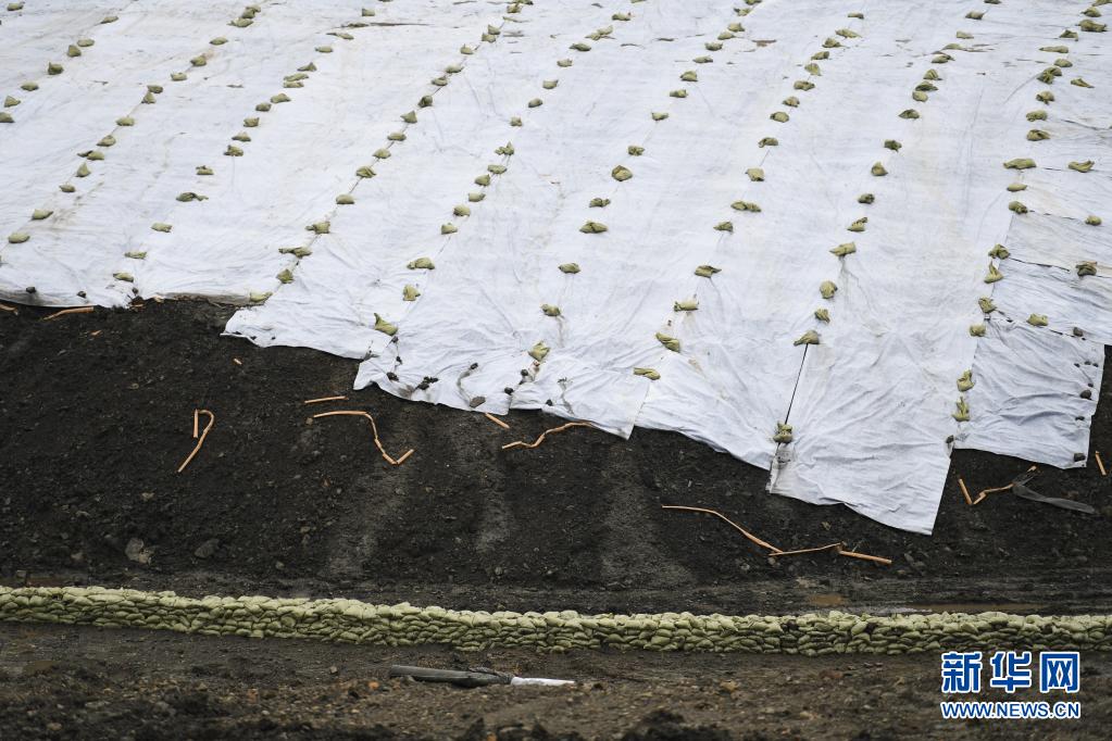 这是8月15日拍摄的救援人员在矿区顶部铺设的防水膜。