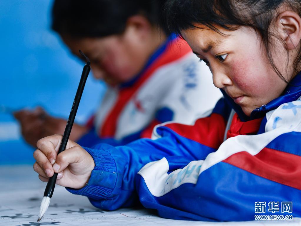 在玉树藏族自治州红旗小学,学生在上书法课(3月19日摄)。
