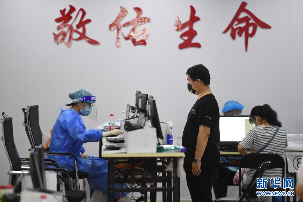 8月16日,在南京市秦淮区新冠疫苗集中接种点,市民在登记信息。