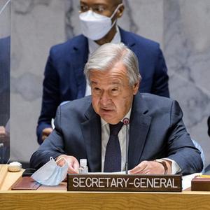 8月16日,在位于纽约的联合国总部,联合国秘书长古特雷斯在安理会就阿富汗局势举行的紧急会议上讲话。
