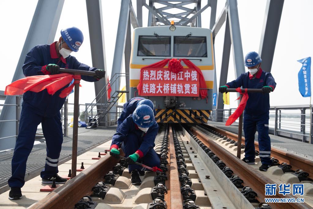 当日,在同江中俄黑龙江铁路大桥施工现场,中俄两国准轨接口最后一组轨道夹板安装完成,标志着中俄两国首座跨江铁路大桥——同江中俄黑龙江铁路大桥实现铺轨贯通,为大桥全线开通运营奠定了坚实基础。