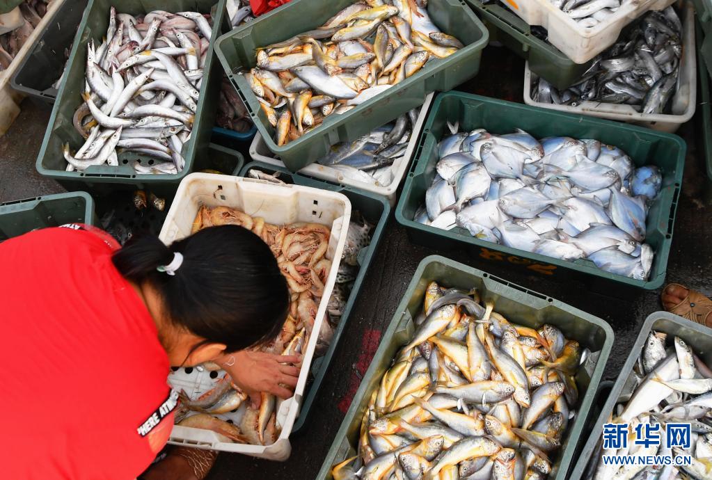 8月17日,在莆田市秀屿区平海镇平海一级渔港码头,渔民在整理海产品。