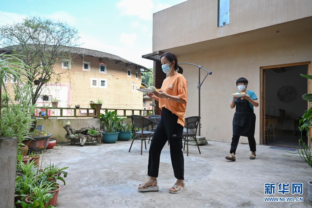 8月17日,在福建省漳州市南靖县书洋镇塔下村一处民宿,在此就业的村民为客人端上早点。