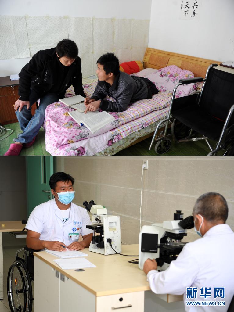 这是一张拼版照片,上图为:2011年3月5日,王雷(右)和同学田春辉在讨论医学问题;下图为:2021年8月16日,王雷(左)在濉溪县医院病理科和同事交流病理知识。新华社记者刘军喜摄