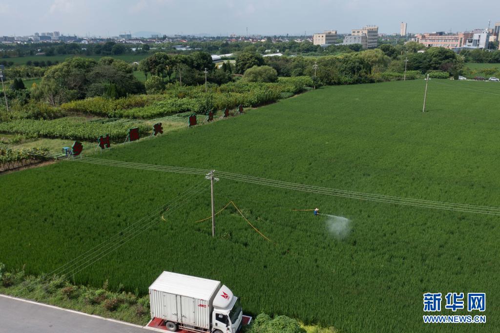 8月18日,在桐乡市大麻镇的稻田里,工作人员统一为代管的农田喷洒农药,这也是“田保姆”社会化服务的项目之一(无人机照片)。