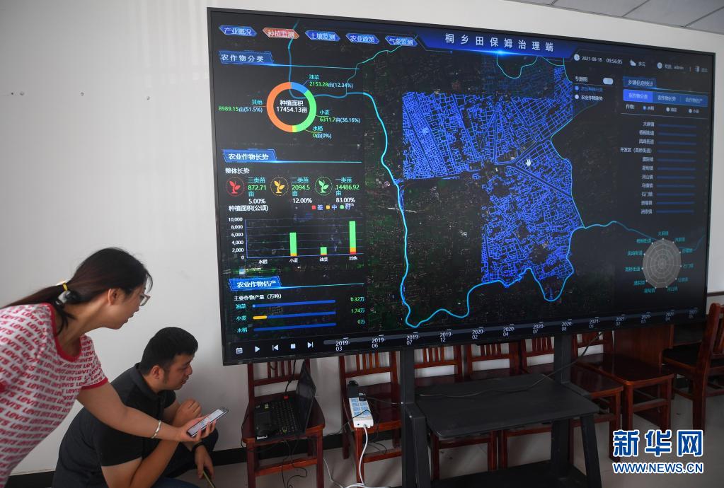 8月18日,在桐乡市大麻镇的“田保姆”服务中心,大屏幕显示农田的各项数据。新华社记者 徐昱 摄