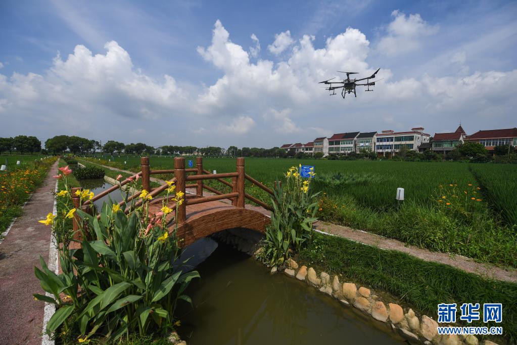 8月18日,在桐乡市大麻镇的稻田里,无人机统一为代管的农田喷洒农药,这也是“田保姆”社会化服务的项目之一。新华社记者 徐昱 摄