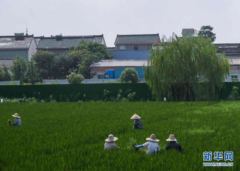 8月18日,在桐乡市大麻镇的稻田里,工作人员为代管的农田除草,这也是“田保姆”社会化服务的项目之一。新华社记者 徐昱 摄
