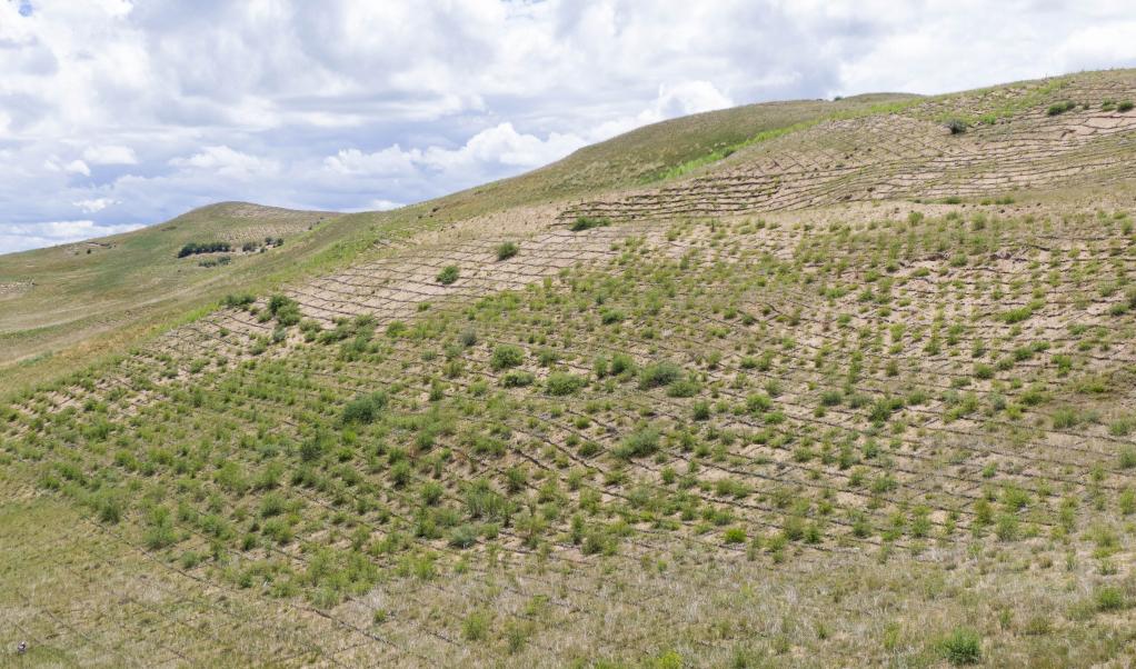 这是前两年经过当地政府以“高原柳沙障+灌草复合种植”治沙模式修复的牧场一角(8月17日摄 无人机照片)。