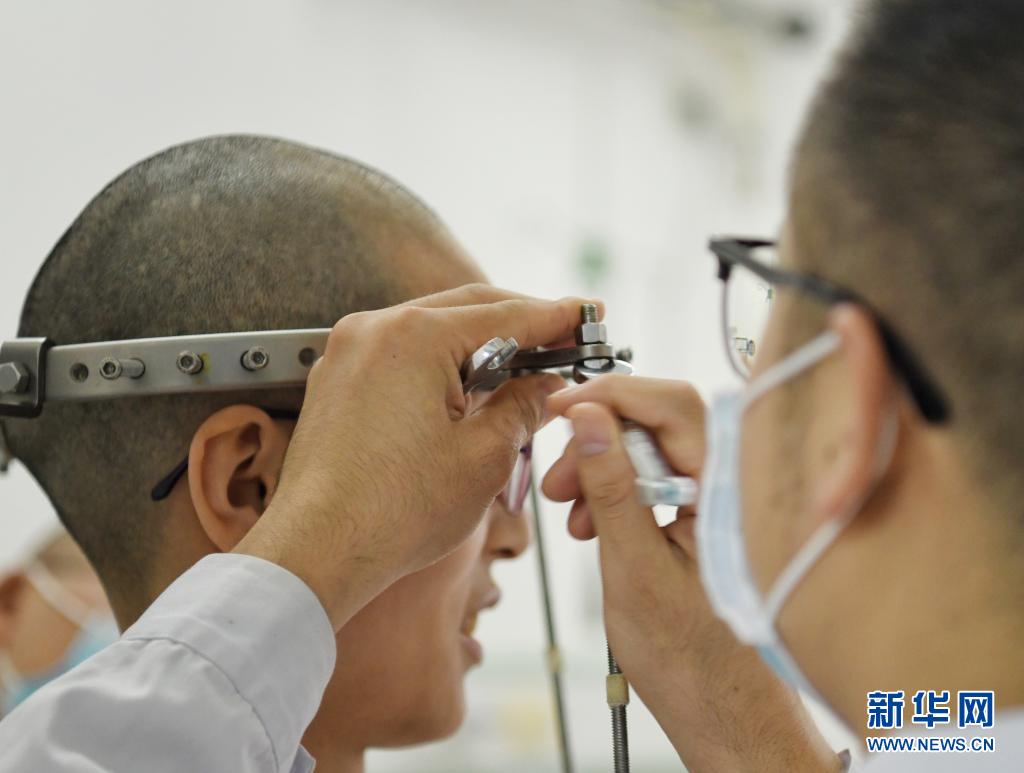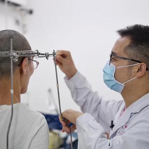 8月17日,黄华强在成都市第三人民医院为病人调整“头盆环”。新华社记者 王曦 摄