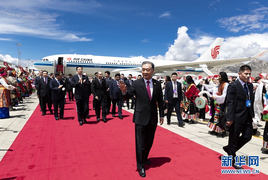 8月18日,以中共中央政治局常委、全国政协主席汪洋为团长的中央代表团飞抵拉萨,出席西藏和平解放70周年庆祝活动。中央代表团在机场受到西藏各族群众的热烈欢迎。新华社记者 黄敬文 摄