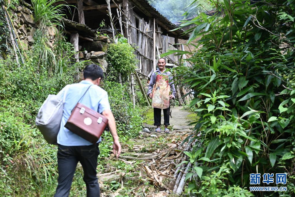 8月18日,武夷山市上梅乡厅下村纱帽畲小组杨富钦老人(右)在家门口迎接杨家福医生。
