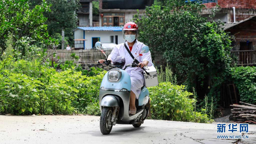 8月17日,杨小燕骑电动车前往珠玉村上洞屯,准备为村里老人做体检,并统计适宜接种新冠疫苗人员信息。