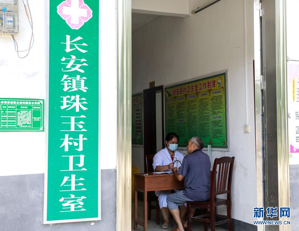 8月17日,在珠玉村卫生室,杨小燕在给一位村民看病。