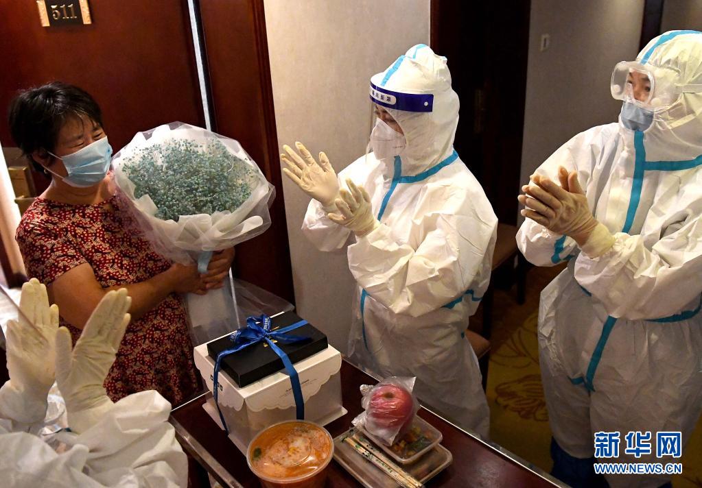 8月18日,在郑州市郑东新区豫鹰宾馆健康关爱中心,王亚如(右二)和工作人员一起为过生日的隔离人员唱生日歌。新华社记者 李安 摄