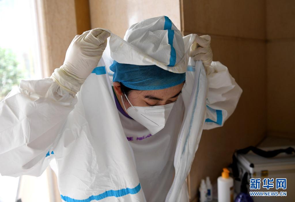 8月18日,在郑州市郑东新区豫鹰宾馆健康关爱中心,王亚如完成出诊工作后脱下防护服。新华社记者 李安 摄