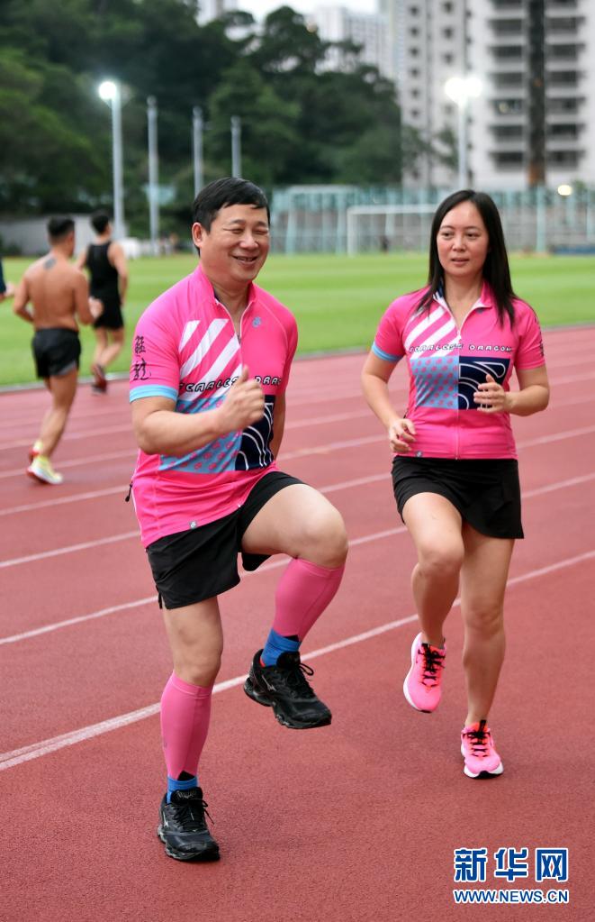猛龙长跑队创办人莫俭荣(左)与领跑员严惠茵训练前进行热身(7月29日摄)。