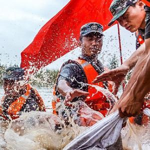 这是河北武警战士在长江大堤上抢险(1998年8月16日摄)。