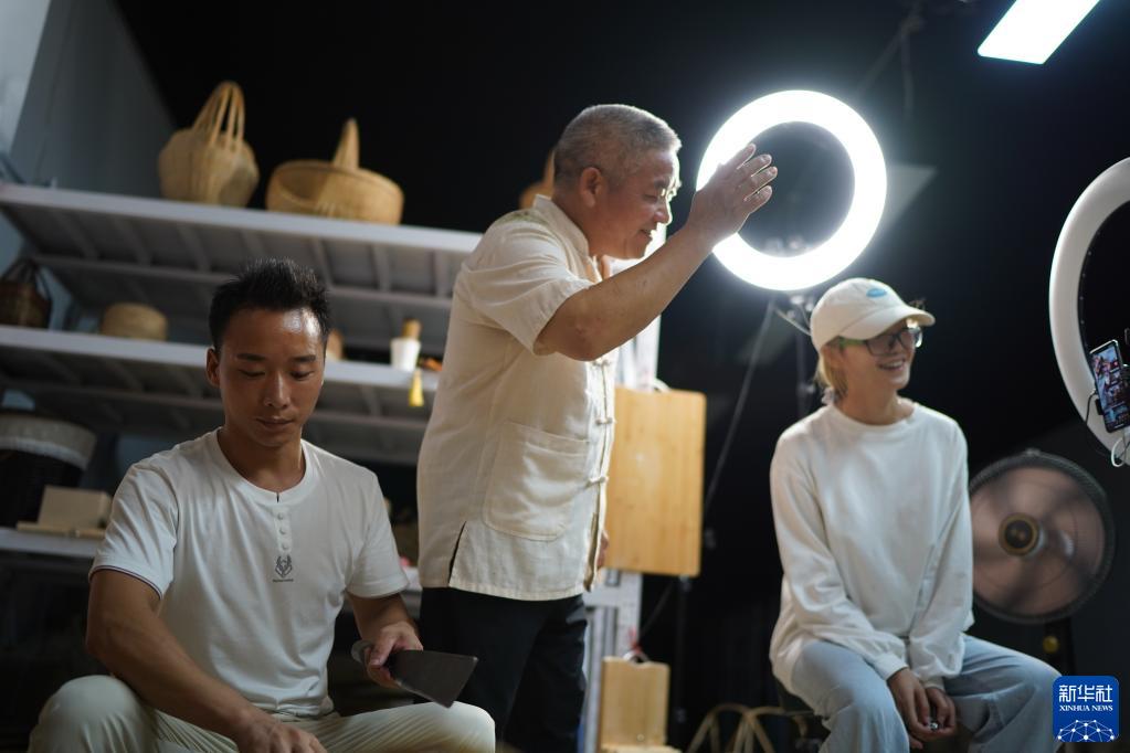 李年根在直播间与团队成员一起介绍自己制作的竹制品(9月1日摄)。