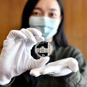 中国金币总公司一名工作人员展示辛亥革命110周年银质纪念币(9月23日摄)。