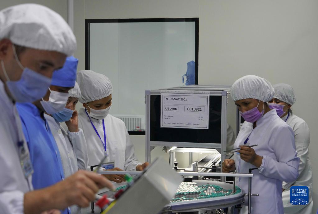 9月5日,在乌兹别克斯坦制药企业祖拉贝克实验室有限公司,工作人员在新冠重组蛋白疫苗生产线上工作。