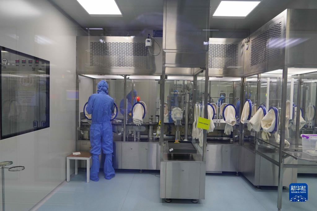 9月5日,在乌兹别克斯坦制药企业祖拉贝克实验室有限公司,工作人员在新冠重组蛋白疫苗生产线上工作。