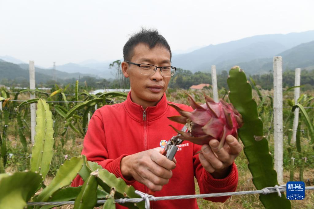 在广西灵川县灵田镇正义村,阳红星采摘已经成熟的火龙果(10月27日摄)。