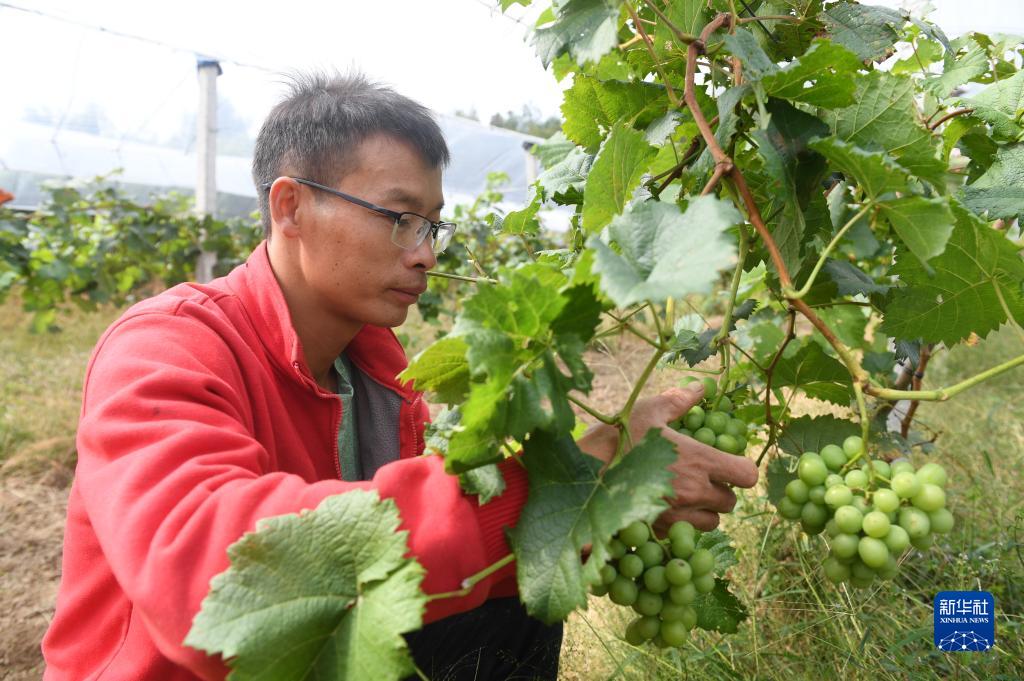 在广西灵川县灵田镇正义村,阳红星在看护葡萄(10月27日摄)。