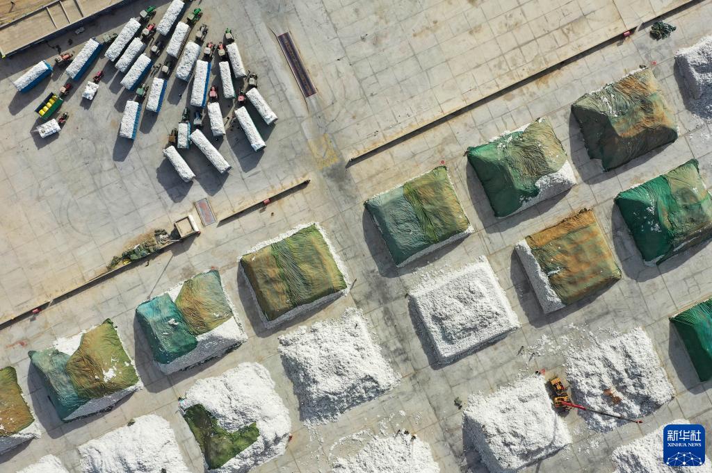 在新疆沙雅县盖孜库木乡的一处轧花厂内,棉农们的拖拉机在排队等待棉花的等级评定,已经收购的棉花被堆成垛(10月26日摄,无人机照片)。