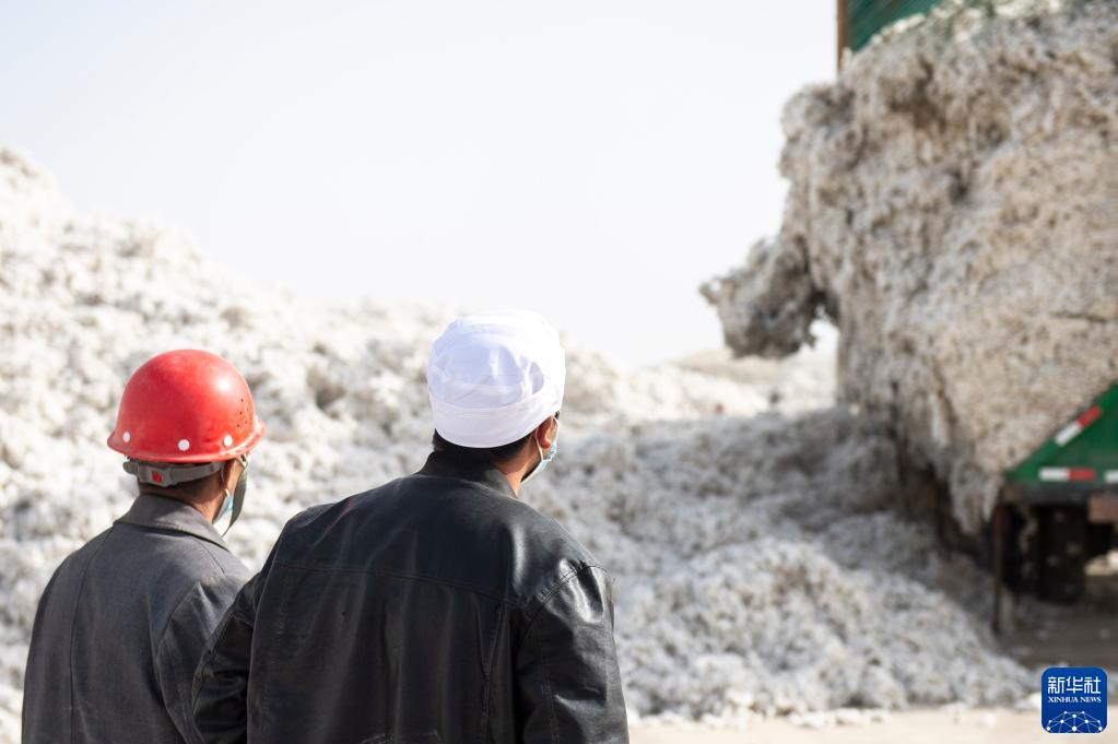在新疆沙雅县盖孜库木乡的一处轧花厂内,艾买尔·艾则孜(右)和父亲看着自家的棉花被收购(10月26日摄)。