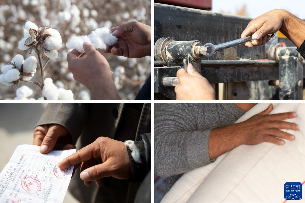 左上:艾买尔·艾则孜在新疆沙雅县盖孜库木乡的自家棉田里,查看棉花质量(10月25日摄)。