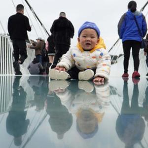 11月12日,一名小朋友坐在张家界大峡谷玻璃桥上等待父母拍照。