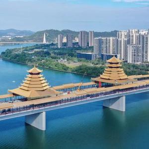 近日,广西柳州市凤凰岭大桥进入施工冲刺阶段,工人们正加紧施工,即将完成铜瓦铺设的大桥仿佛披上一层金色的外衣,成为柳江上一道靓丽风景。