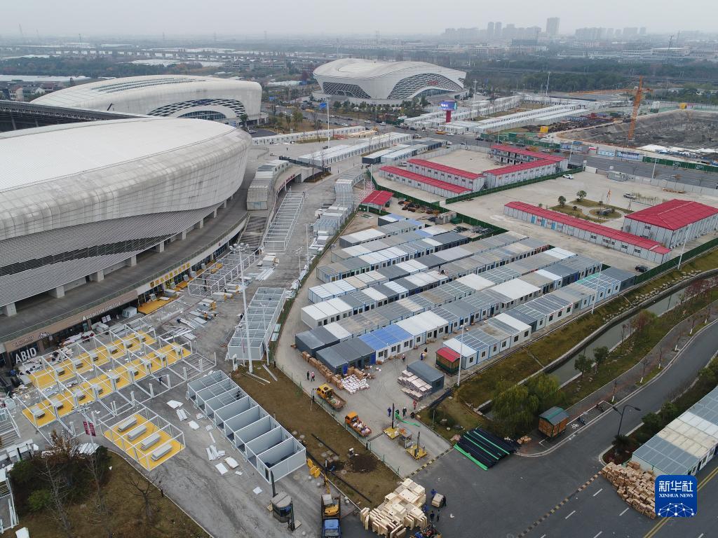 建设中的可容纳2500人的上虞体育中心临时隔离点(12月14日摄,无人机照片)。